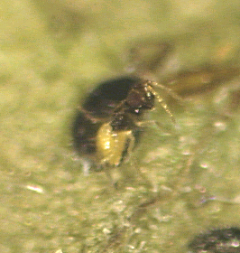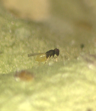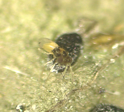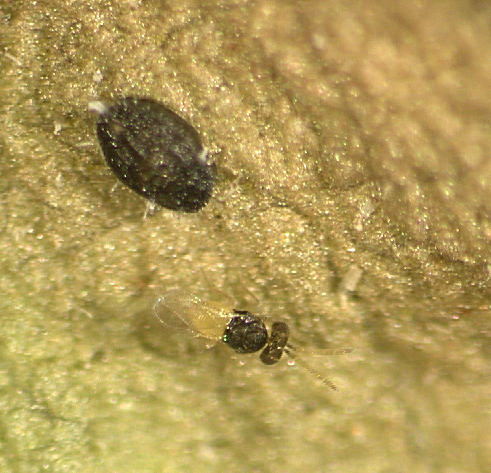 Encarsia formosa are tiny parasitic wasps who lay their eggs inside of whitefly pupae.