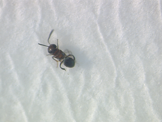 Encyrtus lecaniorum are parasitic wasps who insert their eggs into the sedentary life stage forms of scale, a plant-feeding insect.