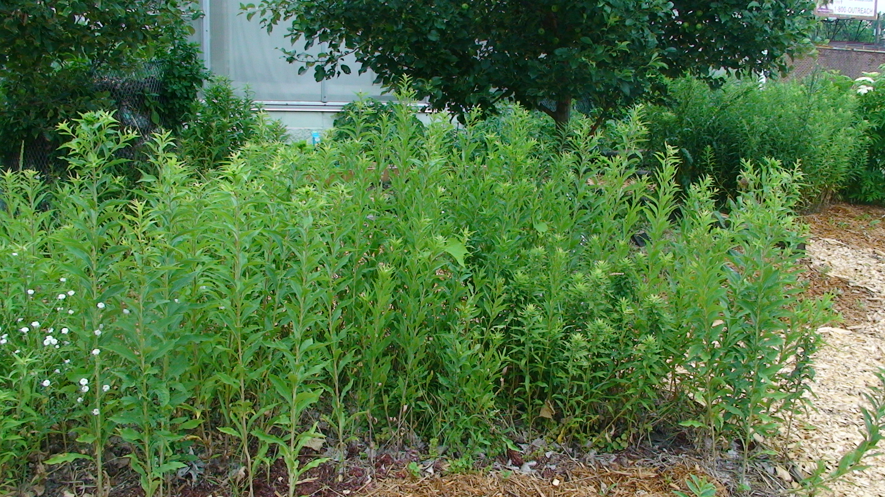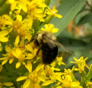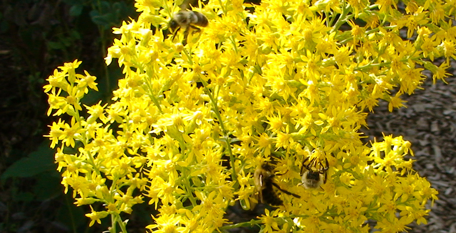 This variety of goldenrod is kind of sneaky. It doesn’t do much for most of the early part of the growing season, but towards the end of July and early August, these plants produce torchlights of yellow flowers that are like bumblebee magnets. The non-invasive species of goldenrods are critical for any garden that aims to support native pollinators.