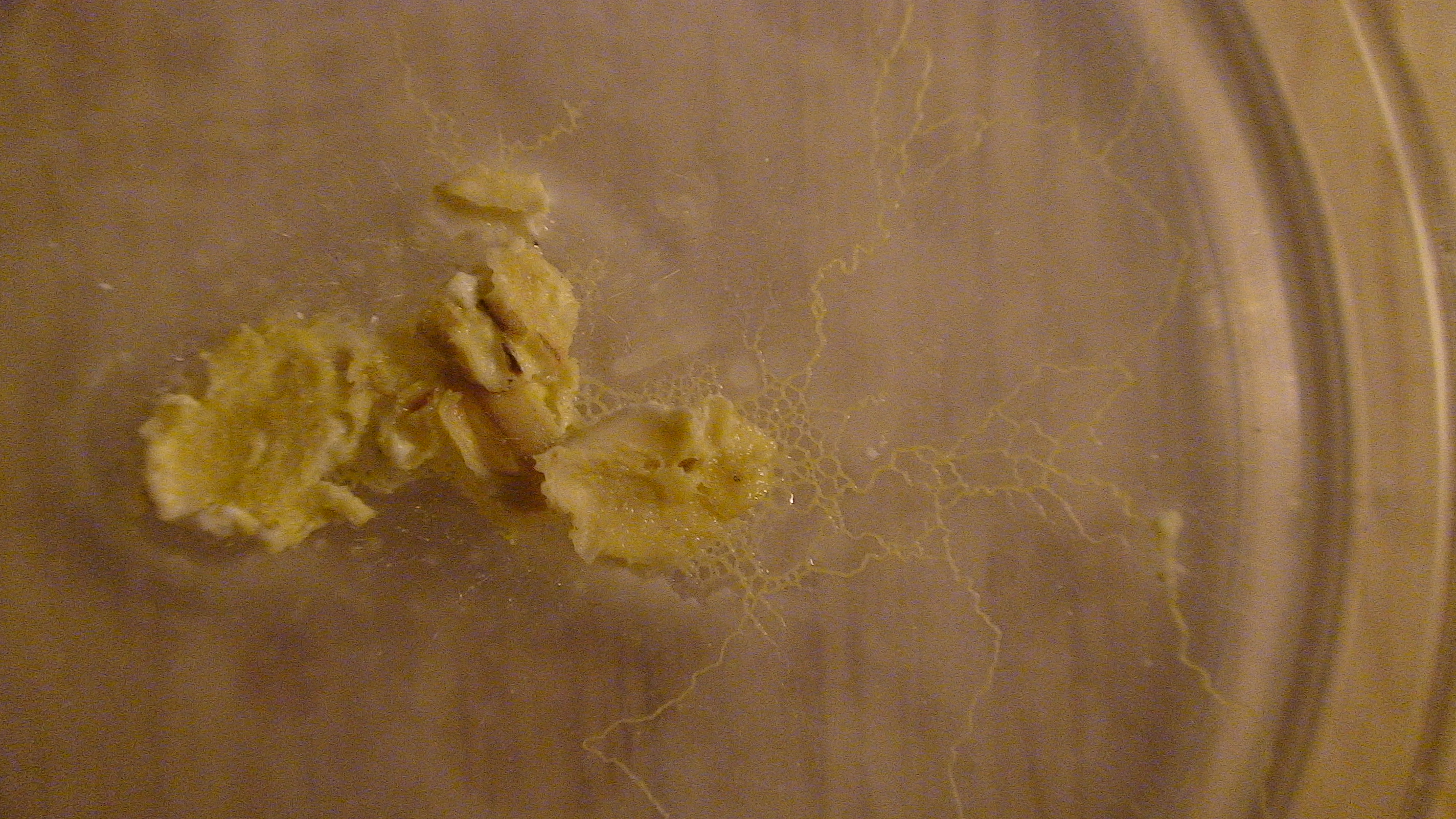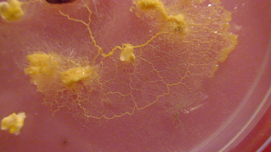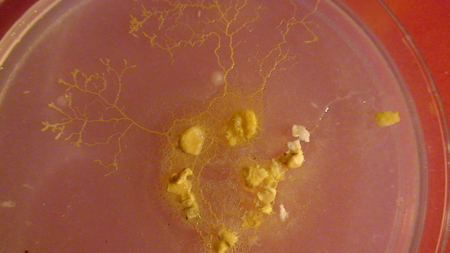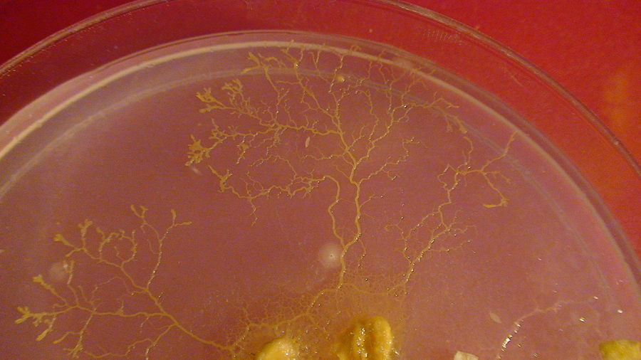 These “Plasmodium” slime molds are actually a network of individual cells that fuse together to form these miniature “bags” of cytoplasm…that swarm and/or “channel” themselves as they search for material to surround and consume. In the case of the slime mold specimens at the MassGlobalMegaCorp Laboratories, we feed them unprocessed oats because it helps lower cholesterol.