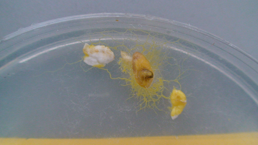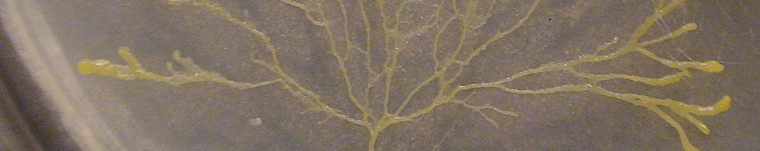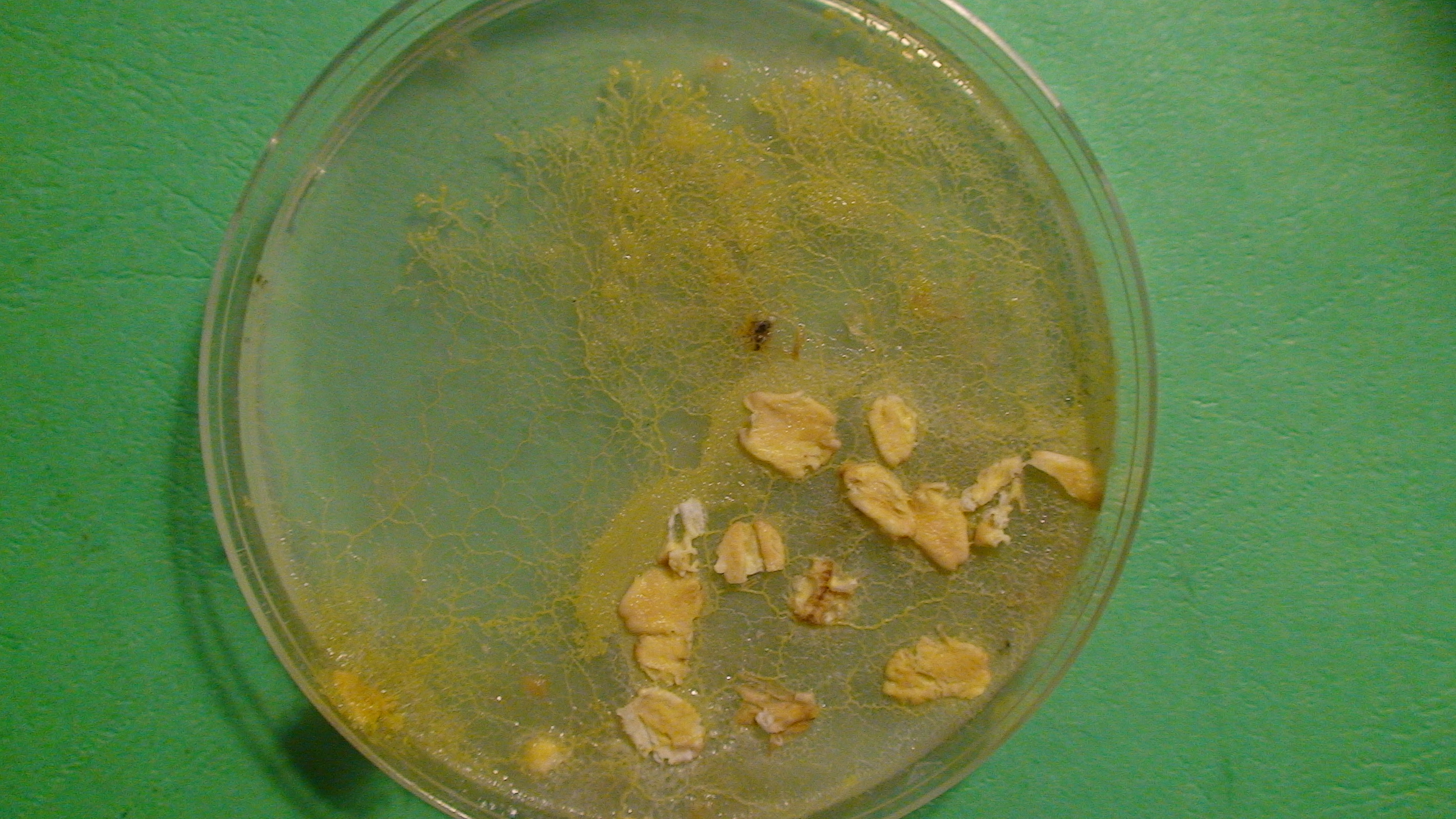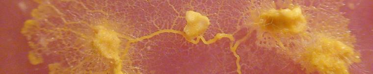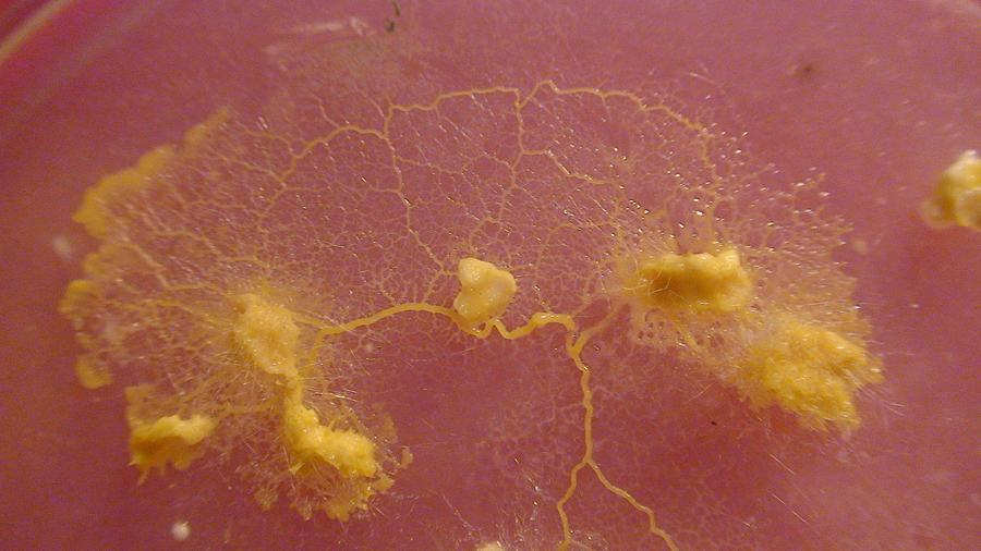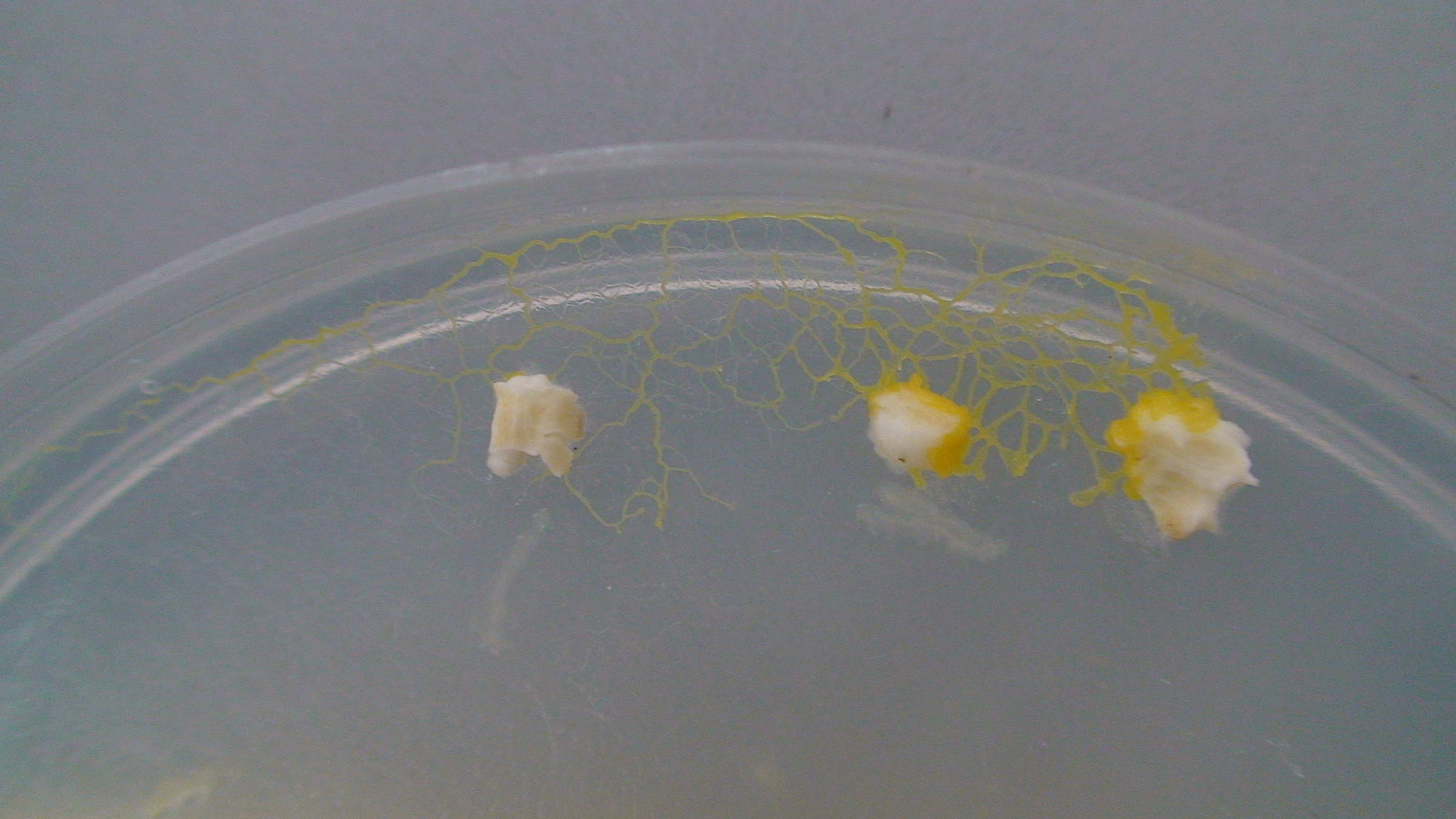 These “Plasmodium” slime molds are actually a network of individual cells that fuse together to form these miniature “bags” of cytoplasm…that swarm and/or “channel” themselves as they search for material to surround and consume. In the case of the slime mold specimens at the MassGlobalMegaCorp Laboratories, we feed them unprocessed oats because it helps lower cholesterol.